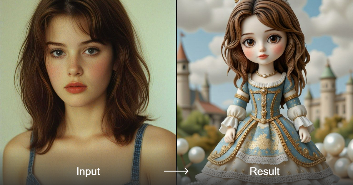 Create 3D, Master, Cute Mode, Toy, and Cute Doll images with our 3D Classic Doll style converter. Compose your own unique design with multiple style components.