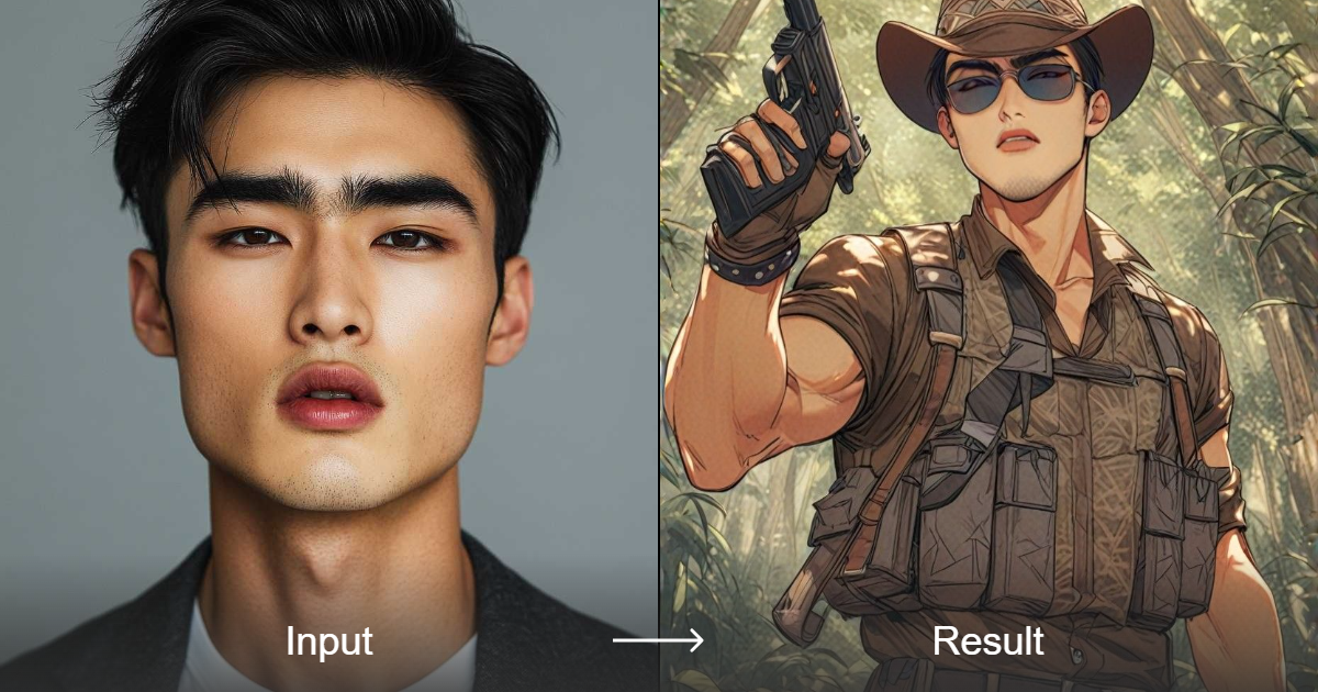 Create cute, painting, and anime-style images with a1.art's handsome soldier style converter. Output format examples included.