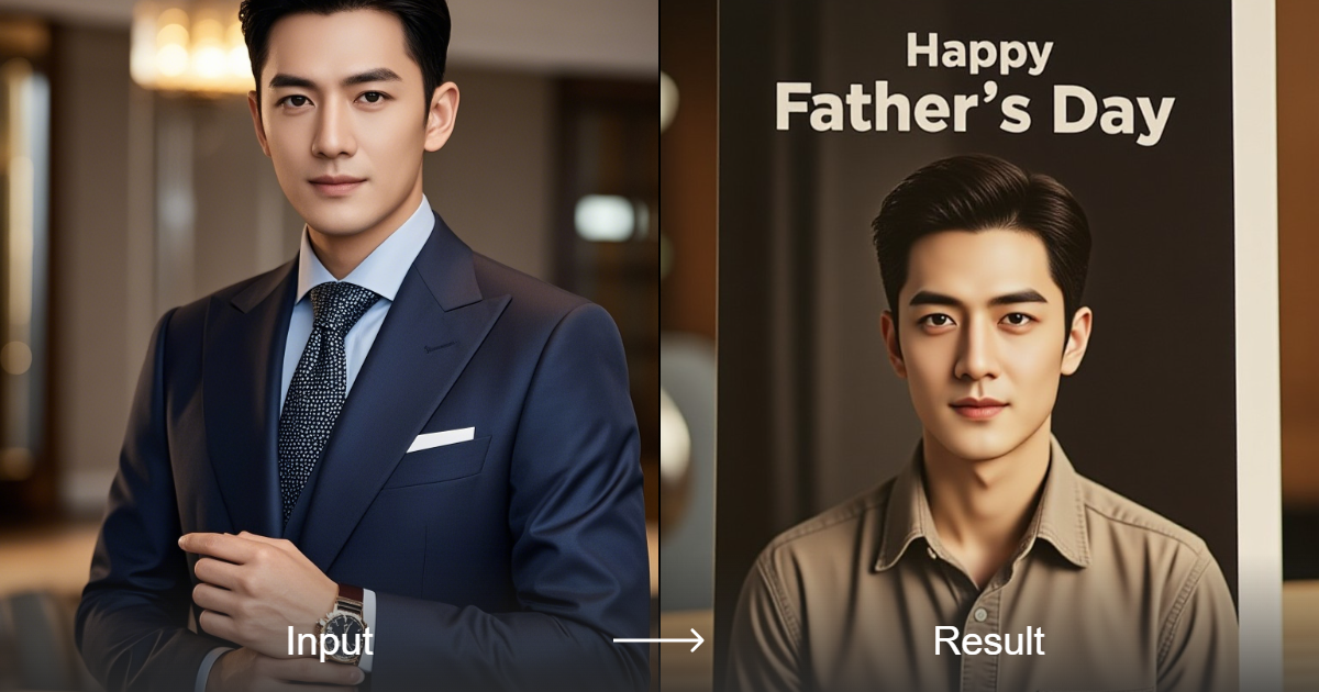 Create a high-quality, realistic Father's Day greeting card featuring your father in a portrait, taken by a polaroid camera, with an artistic touch from a master photographer.
