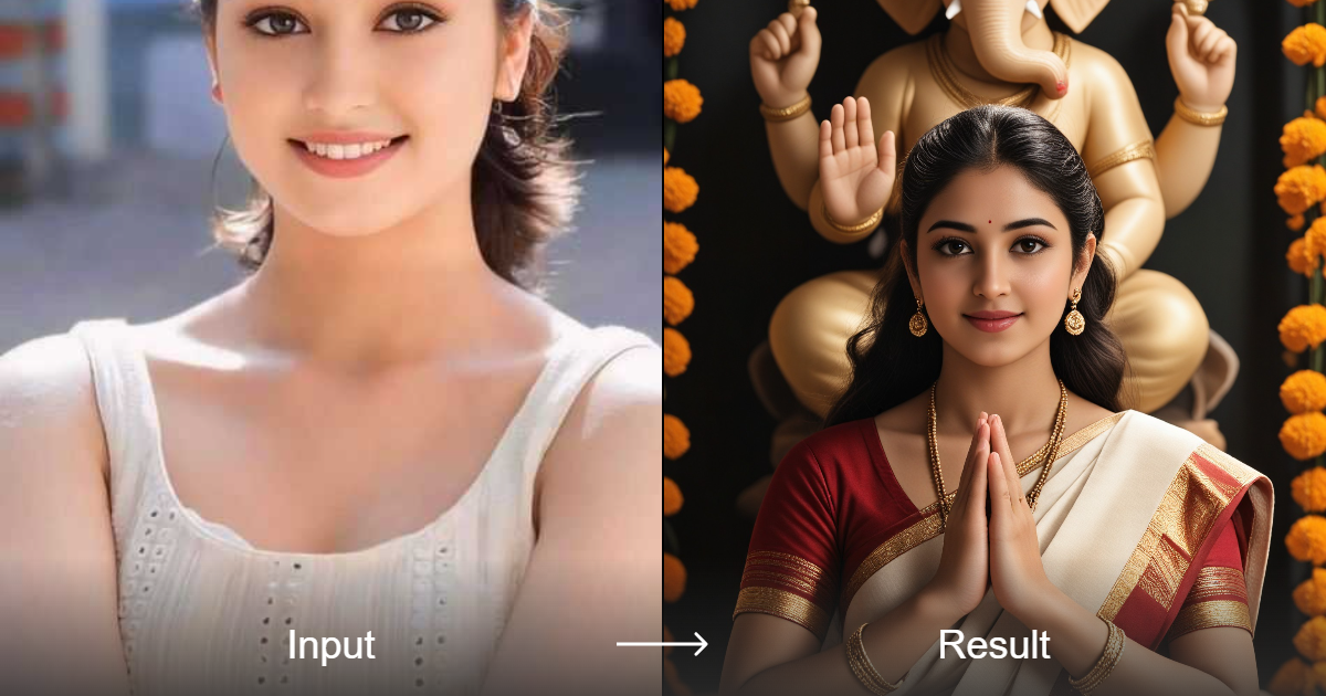 Transform your imagination into a vivid 3D cartoon portrait of an Indian woman in traditional attire, praying before a Ganesha idol with detailed realism.
