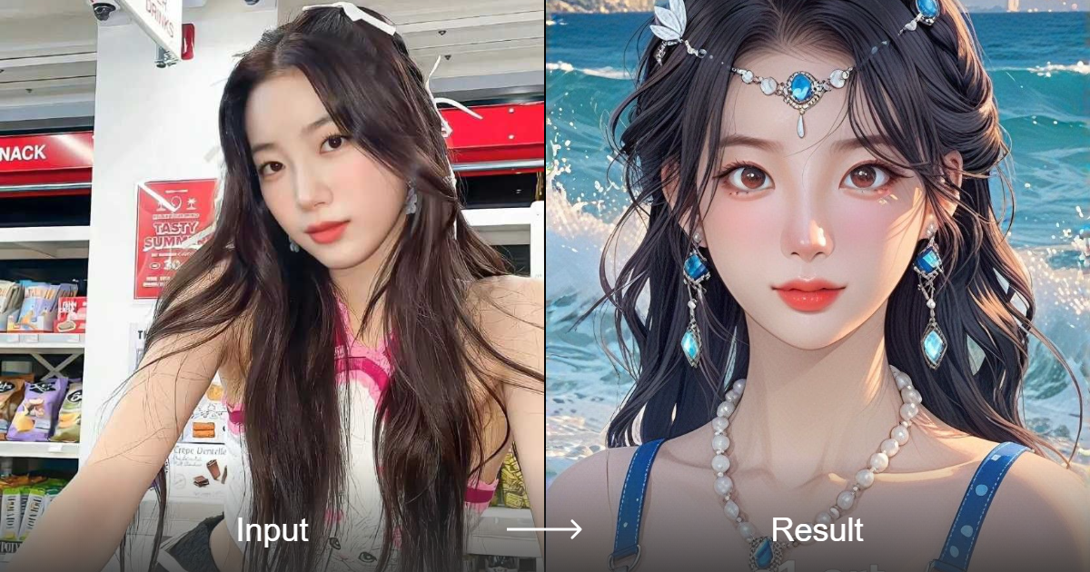 The Too Bad! Become an Ocean Elf 🌊 style converter allows users to transform their photos into a painting or anime style. The converter is composed of multiple style components, including a unique painting style and an anime-inspired character design.