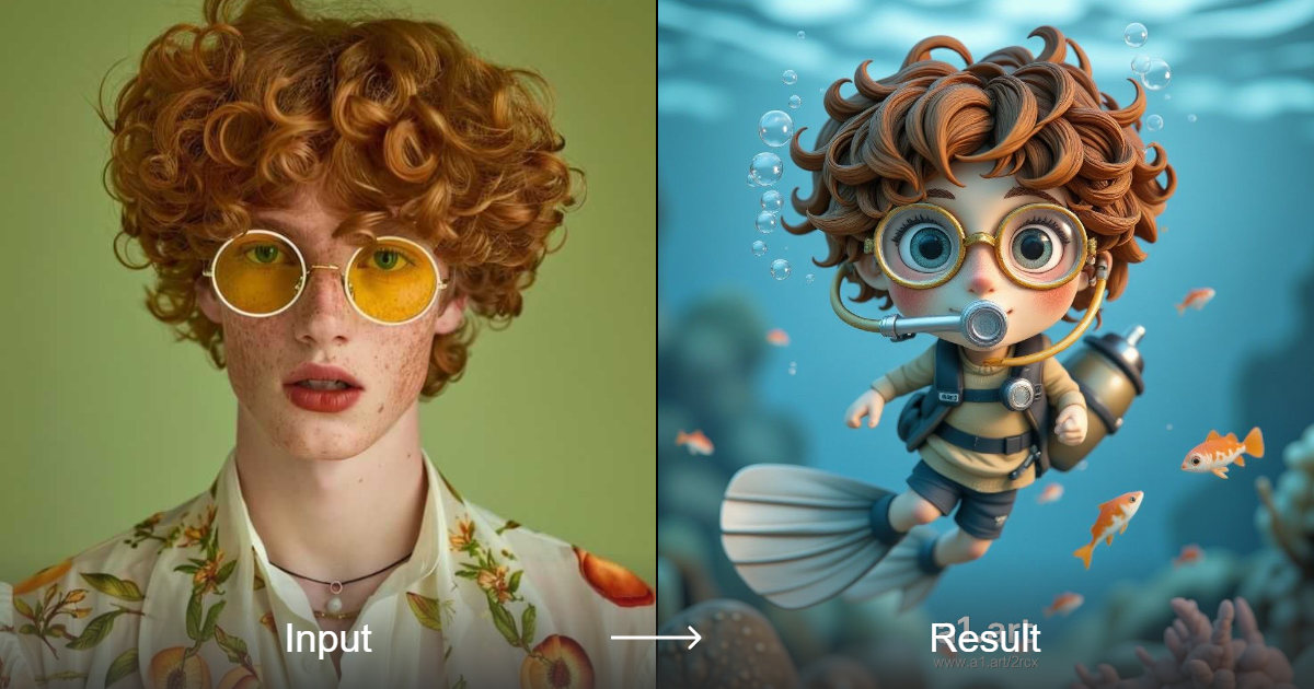 قم بتحويل صورك الحديثة بسهولة إلى مشاهد كرتونية تحت الماء ساحرة باستخدام a1.art. اغمر نفسك في الإبداع بكل يسر.