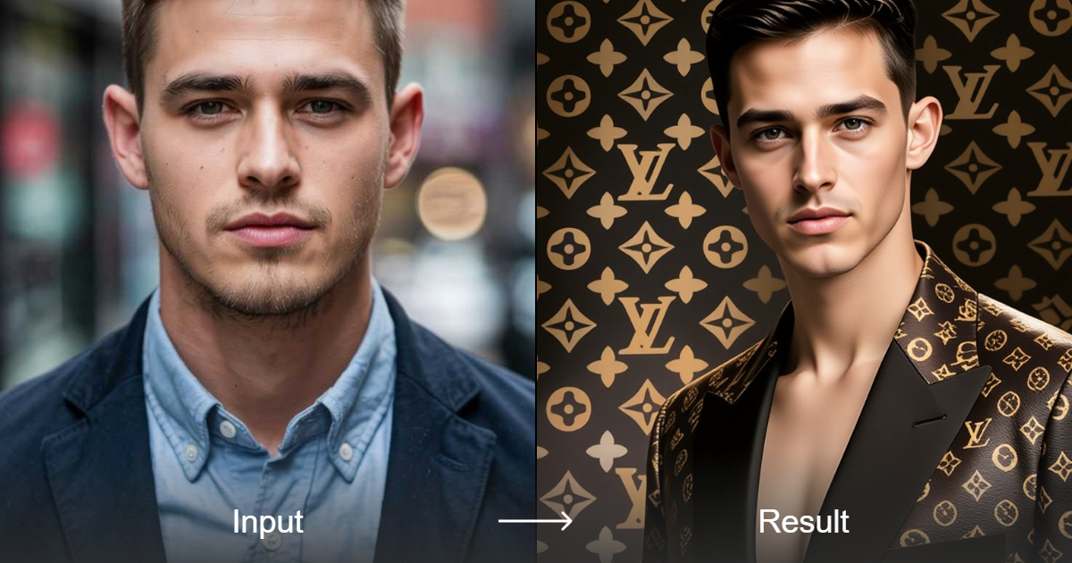 أنشئ صورًا رمزية رائعة بأسلوب لويس فويتون مع عناصر واقعية وأزياء، مع إبراز تفاصيل فاخرة وأنماط مونوجرام أيقونية.