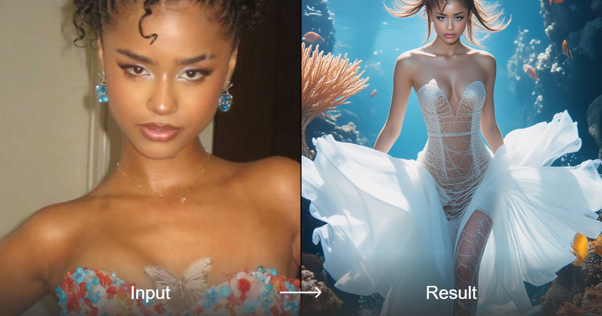 حوّل صورك إلى صور رائعة لعارضات الأزياء تحت الماء بألوان زاهية وتفاصيل دقيقة وإضاءة سينمائية.