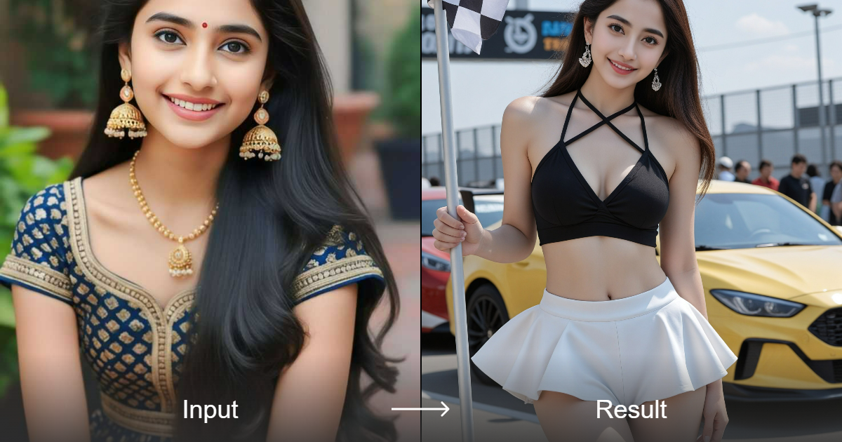 حوّل صورك إلى أعمال فنية رائعة بأسلوب سباقات السيارات تظهر فيها فتاة مرتدية بدلة سباق أنيقة على خلفية مشرقة لمسار السباق.