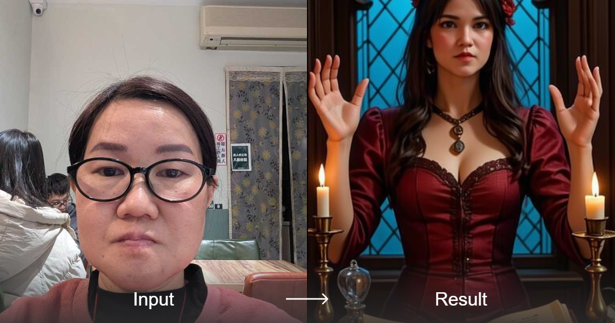 حوّل صورك إلى مشاهد مفصلة بعناية تظهر فيها امرأة ساحرة مرتدية فستانًا بلون العنابي تقوم بطقس ديني تحت ضوء الشموع، مع خلفية مشرقة من الزجاج الملون.