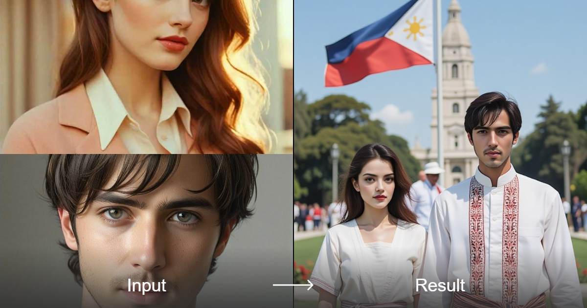 Create stunning portraits of couples at the Philippines Independence Day event in Rizal Park, Manila, featuring traditional Filipino attire and a vintage polaroid camera effect.