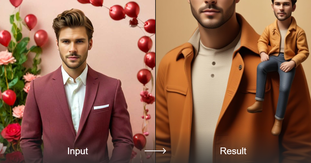 قم بإنشاء صورٍ واقعية تشبه الأحلام وتشبه الدمى باستخدام صورتك الشخصية. ضع نسخة مصغرة من نفسك على كتفك، بحيث تتماشى مع أسلوب اللباس الخاص بالشخص الرئيسي.