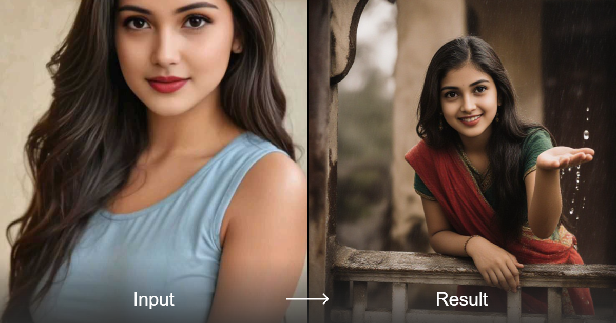 Create stunning rain scenes with our 'I Catch the Rain!' filter. Upload your photo to instantly transform it into a traditional Indian house setting, complete with raindrops and a girl reaching out to catch them.