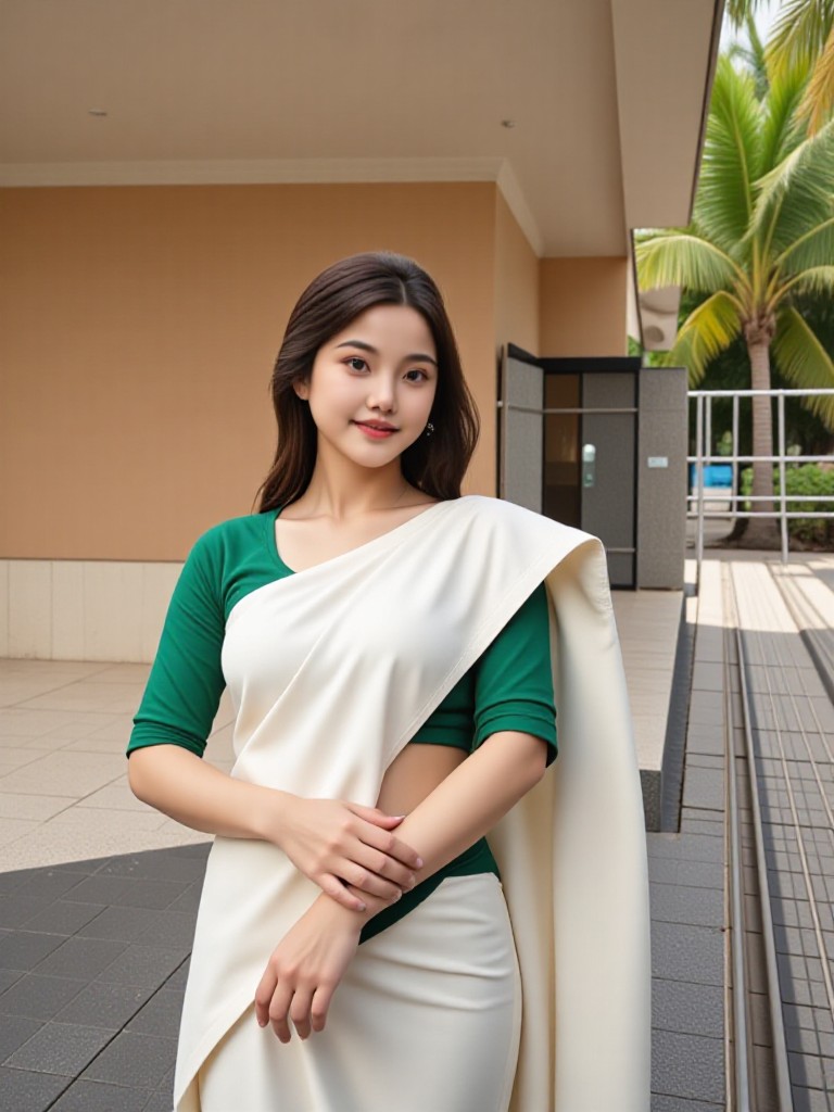 قم بتحويل فنك باستخدام محول نمط a1.art الشاطئ المُعاد مزجه، لإنشاء مشاهد شاطئ استوائي مذهلة مع امرأة واثقة مرتدية بدلة لامعة من اللاتكس تحت أشعة الشمس.