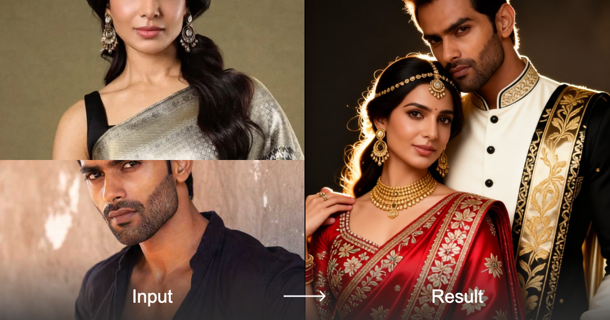 Create stunning luxury couple portraits with our AI filter. Achieve Bollywood-style elegance, royal attire, and cinematic lighting for your photos in seconds.