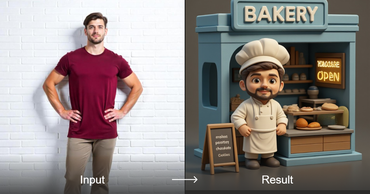 حوّل أفكارك إلى مشاهد ثلاثية الأبعاد لمخابز مصغرة ولطيفة وواقعية باستخدام محول الأسلوب المبتكر الخاص بنا.