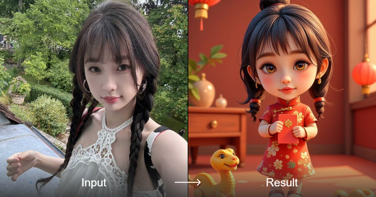An AI image generator that creates cute little girls in traditional Chinese cheongsam with red envelopes in hand, surrounded by festive decorations such as red lanterns and red couplets, in a cartoon-style 3D rendering with smooth lines and vivid colors.