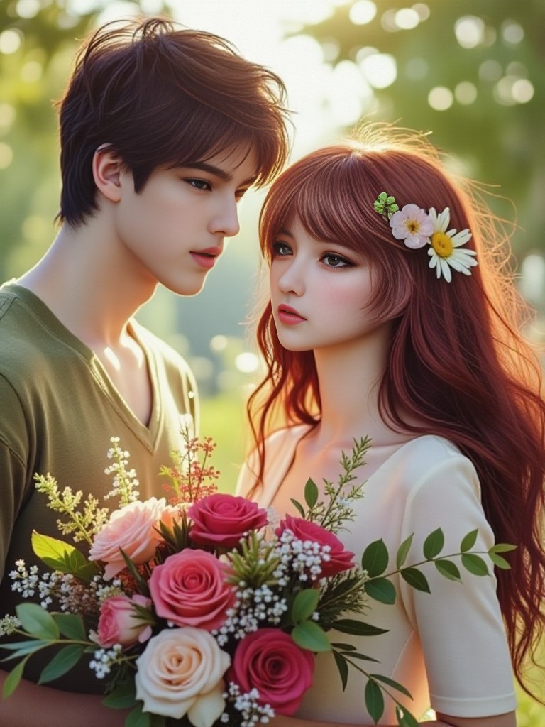 حوّل صورك إلى لوحة زوجين مذهلة تحمل باقة زهور، تتميز بألوان نابضة بالحياة وجمالية كلاسيكية قديمة الطراز.