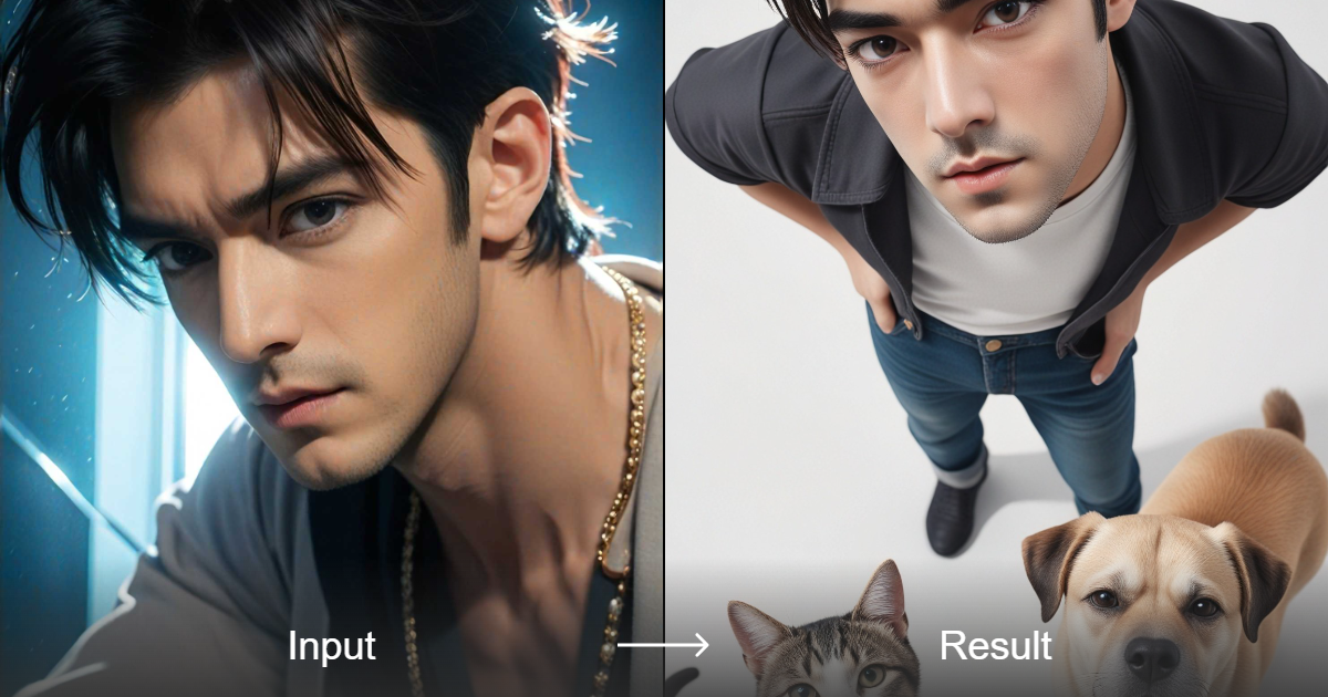 محول نمط الفن الرقمي ثلاثي الأبعاد يُظهر التباين بين رجل وسيم جاد وحيوان أليف لطيف | a1.art