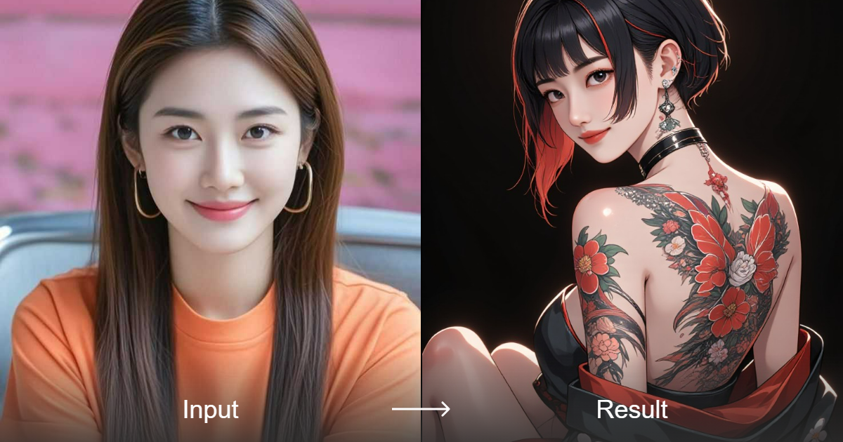 حوّل أفكارك إلى وشمٍ حيّ ومُلهم من أنمي باستخدام محوّل نمط الوشم من A1.Art. جرّب اندماج السحر الكلاسيكي والفن الرقمي.
