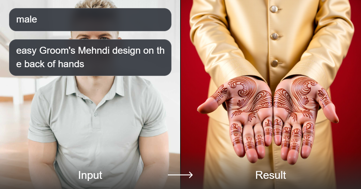 قم بإنشاء صور مذهلة وواقعية لعريس يرتدي تصاميم مُعَقَّدة من الحناء (مهندي) ومظهراً تقليدياً لحفل زفاف هندي.