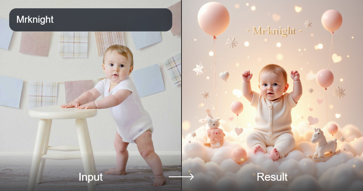 حوّل صور مولودك إلى عوالم أحلام ساحرة وواقعية وتشبه الألعاب، مكتملة بعناصر سحرية وإضاءة ناعمة ودافئة.