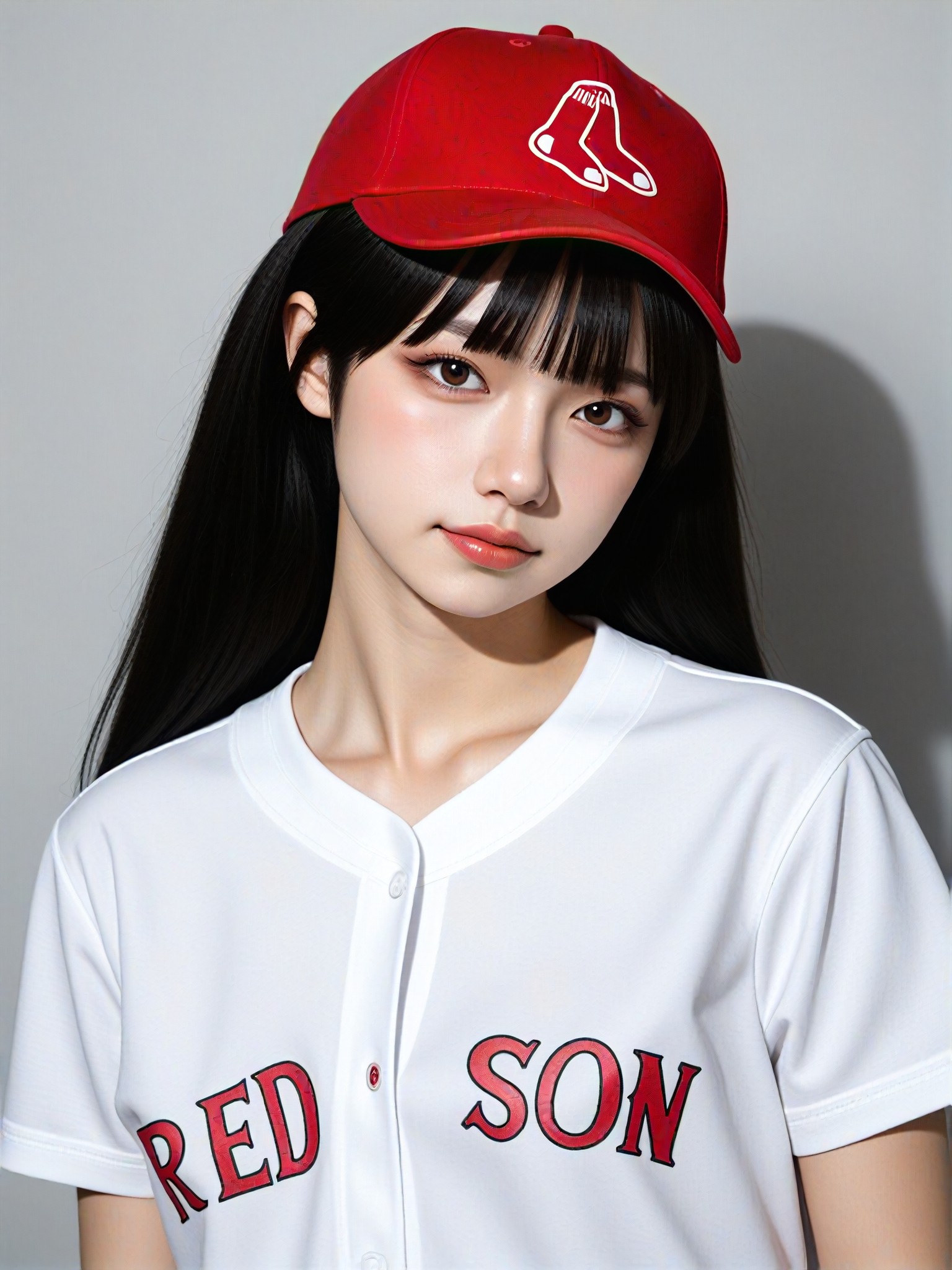 أنشئ صورة واقعية لنفسك ترتدي قبعة من نوع ريد سوكس مع قميص يناسب الأسلوب.
