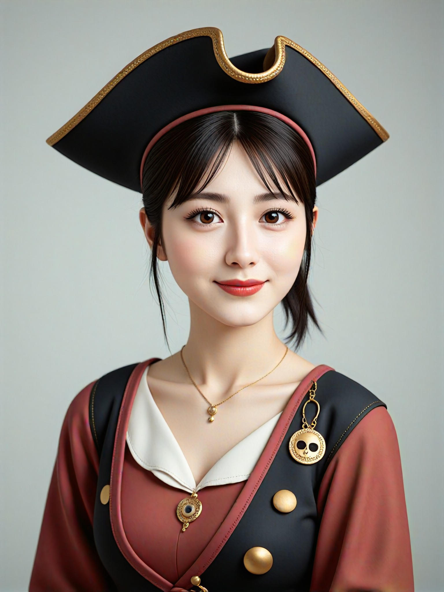 Experience the ultimate virtual try-on with a realistic and master-composed image featuring a single person wearing a pirates hat. Create stunning visuals that match your top, perfect for social media and marketing campaigns.