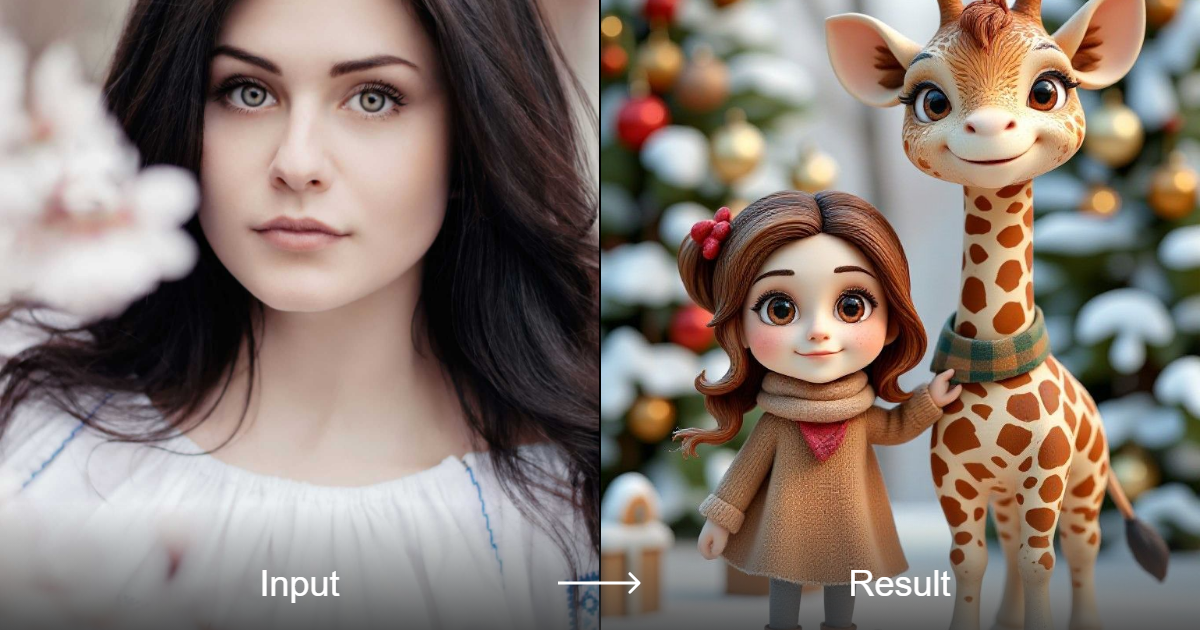 صورة لطيفة ثلاثية الأبعاد لفتاة مع زرافة، مثالية لعطلة الشتاء.