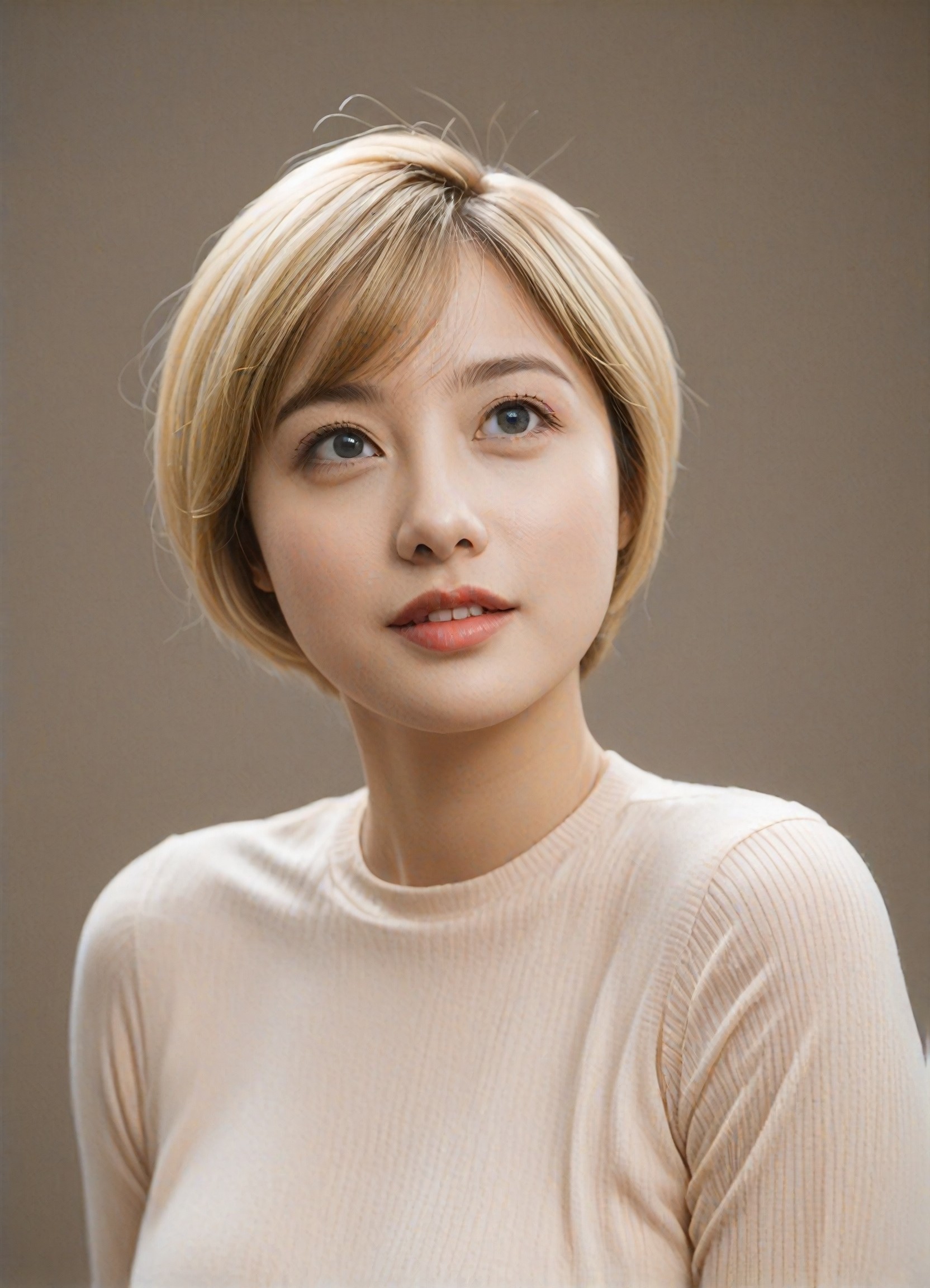 Create realistic, portrait photography of one person with short blonde hair. Wear a top that matches the hair style and hair color. Try on virtual short blonde hair with a1.art's Style Converter.