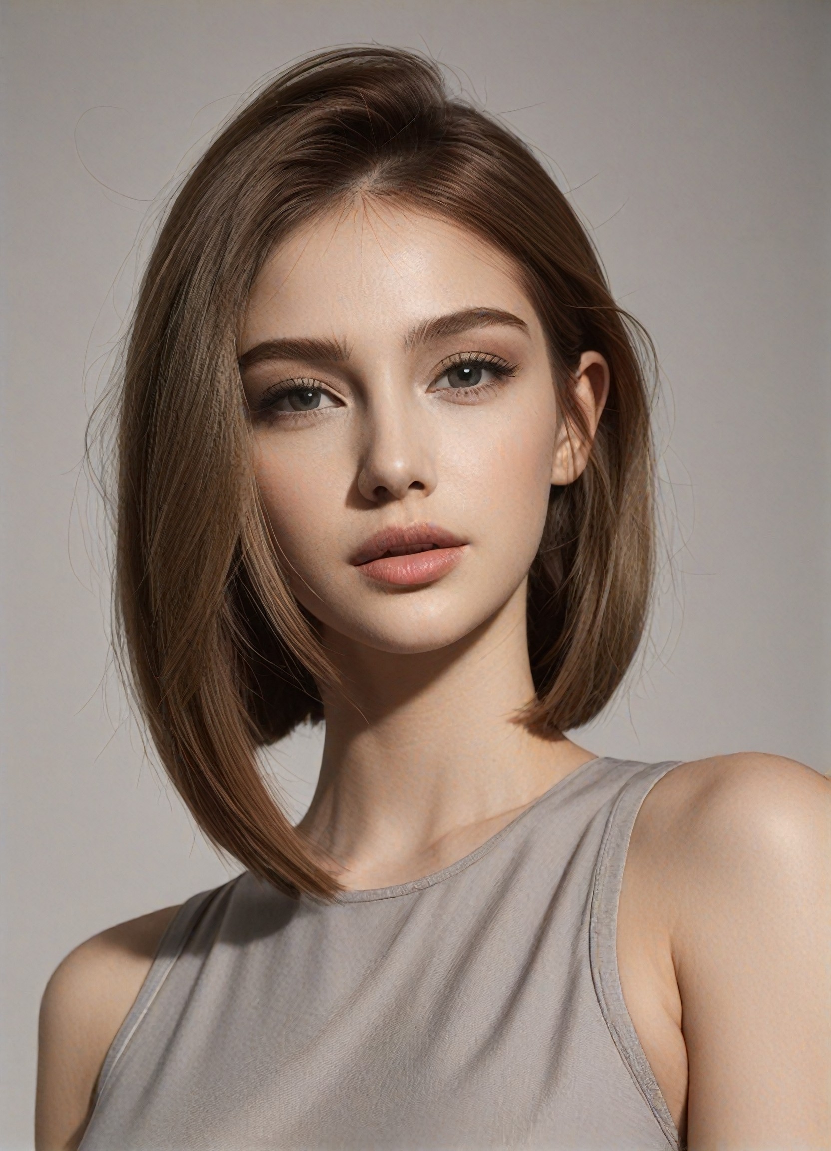 Realism, Photography, Featured Style Converter. Composed of different style components to generate realistic, portrait photography of one person wearing a top that matches the hair style and hair color. Perfect for showcasing women's bob hair.