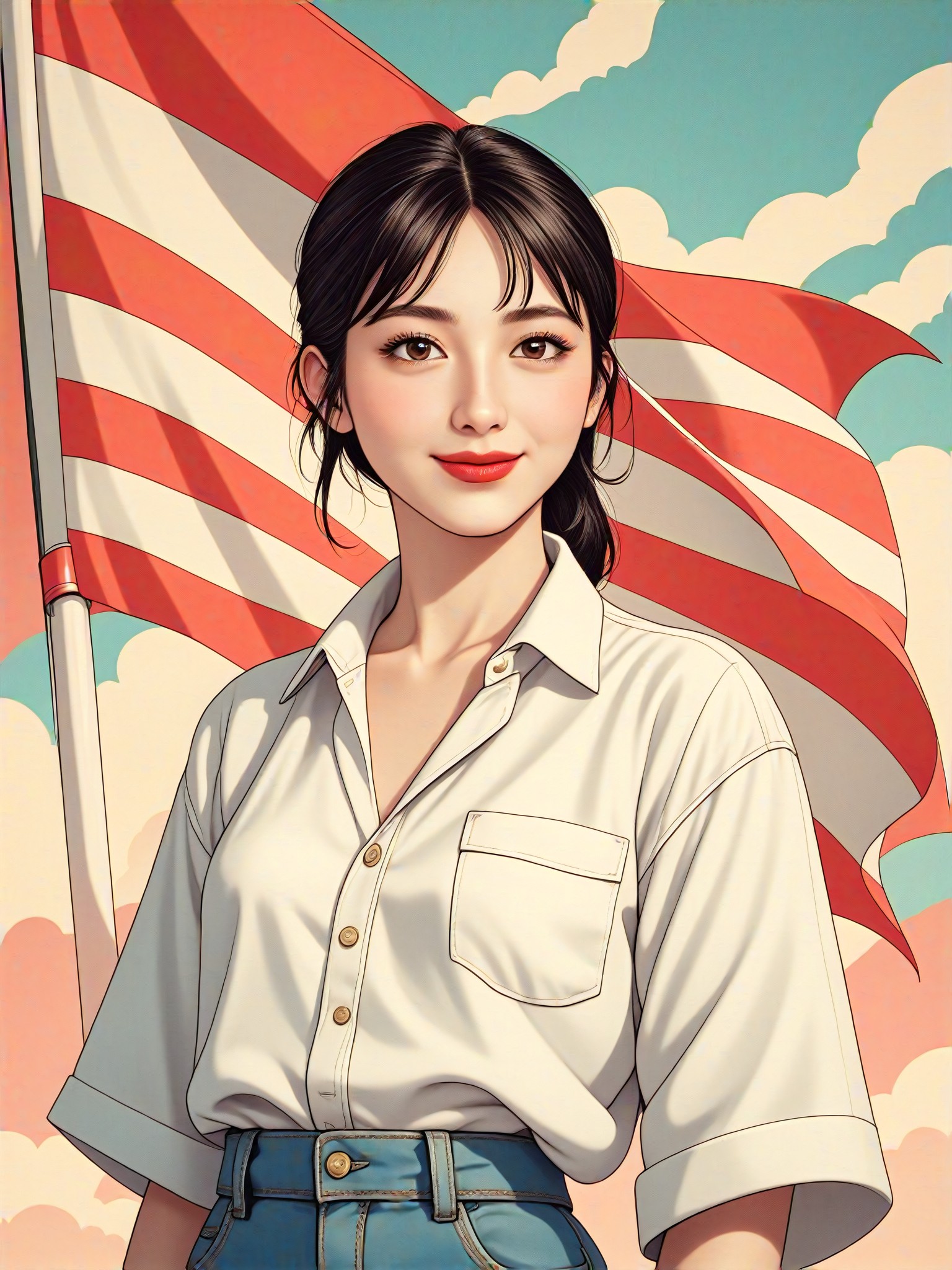 A style converter that adds a red and white striped flag to a photo. The output format includes CG 1.0, Master, Animation, CG 2.0, Digital Painting, and Featured. The generated image is suitable for illustration and digital painting purposes.