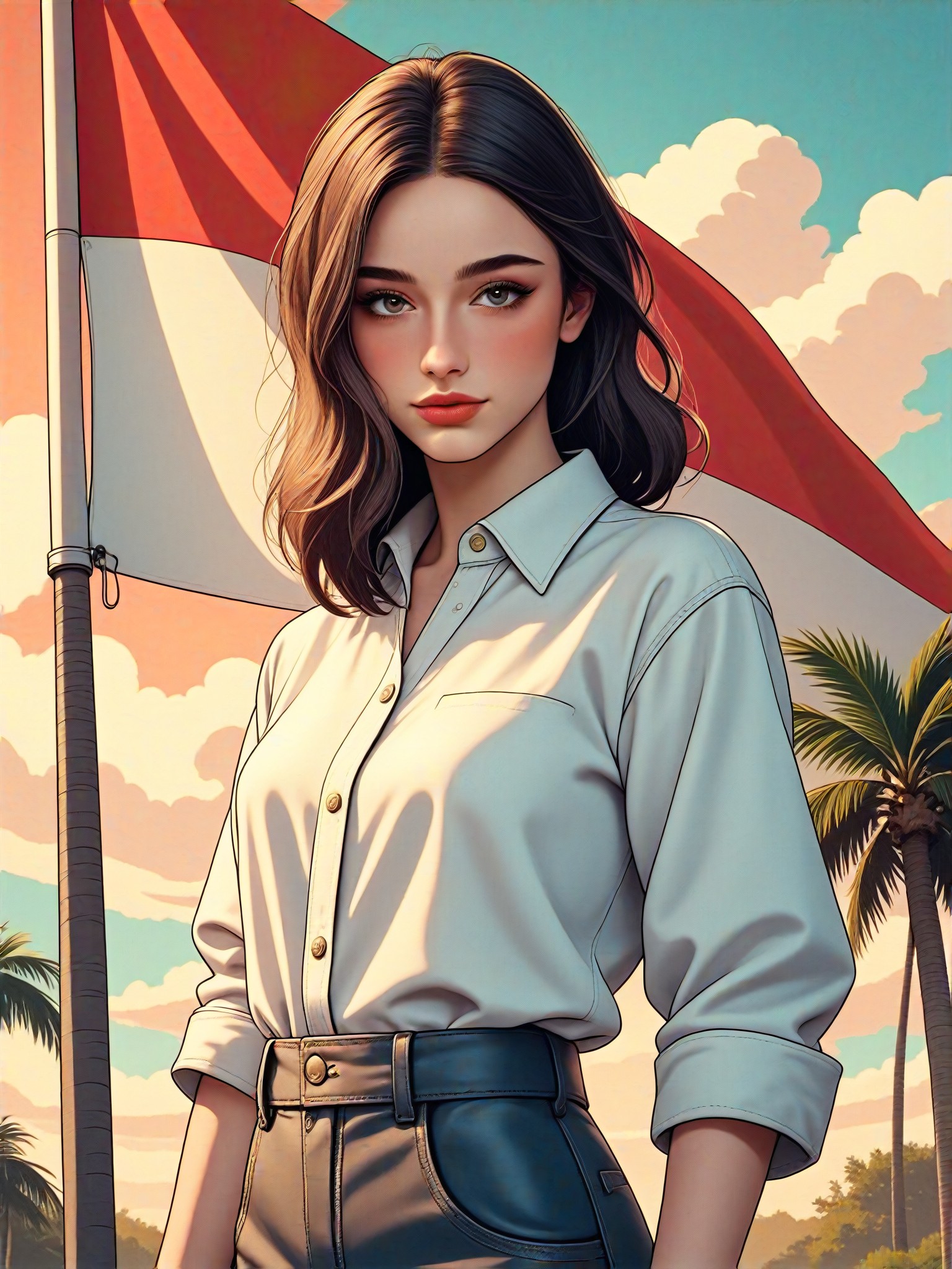 إنشاء لوحات فنية رقمية، ورسوم توضيحية، ورسوم متحركة لشخص يرتدي قميصًا أبيض وعلم كاليدونيا الضخم يرفرف خلفه.