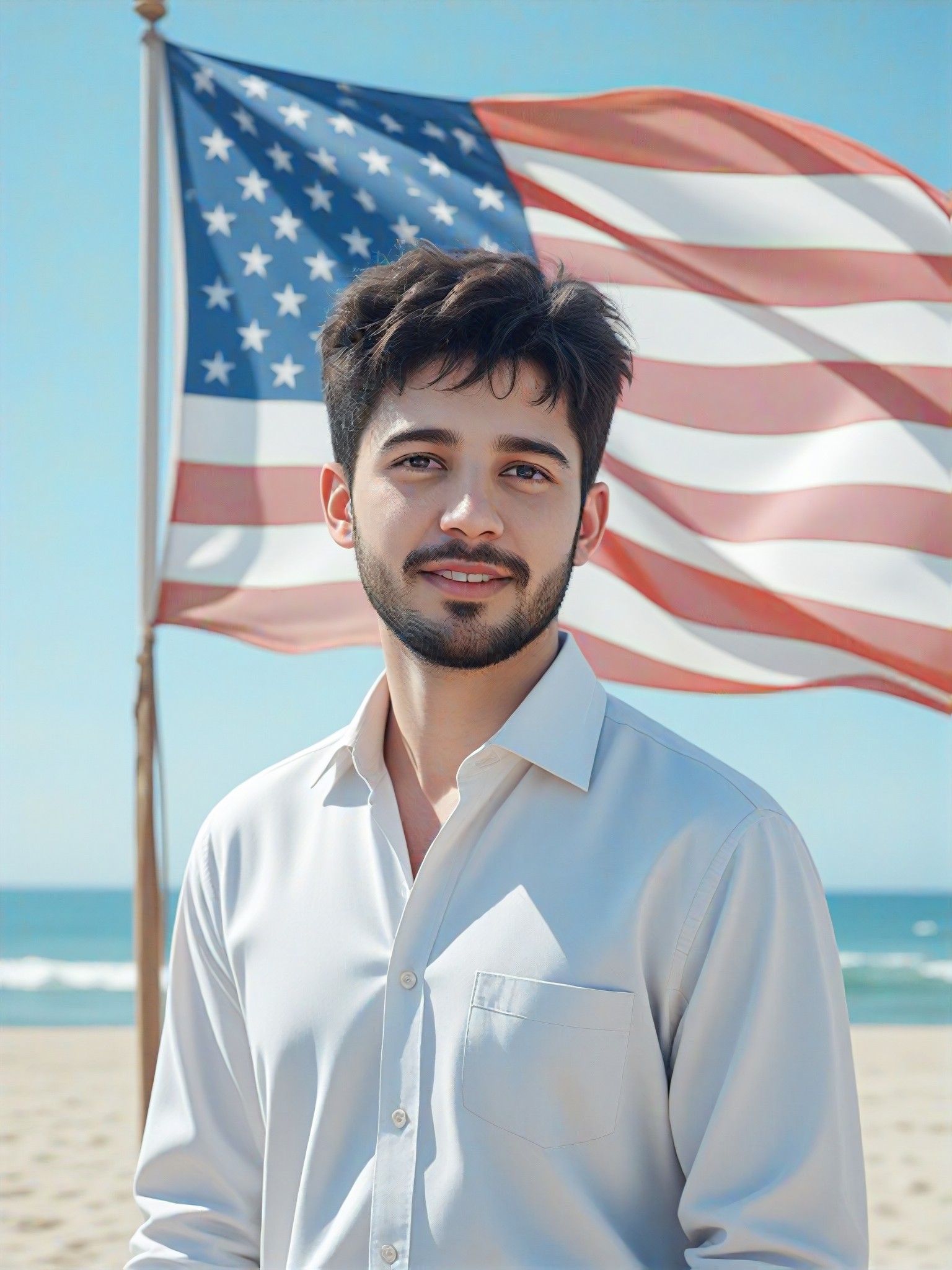 A style converter that adds a beachfront flag to a photo. The output format is an illustration or animation with a person wearing a white shirt and a huge beachfront flag flying behind them. The style is composed of different components, including digital painting, CG, and animation.
