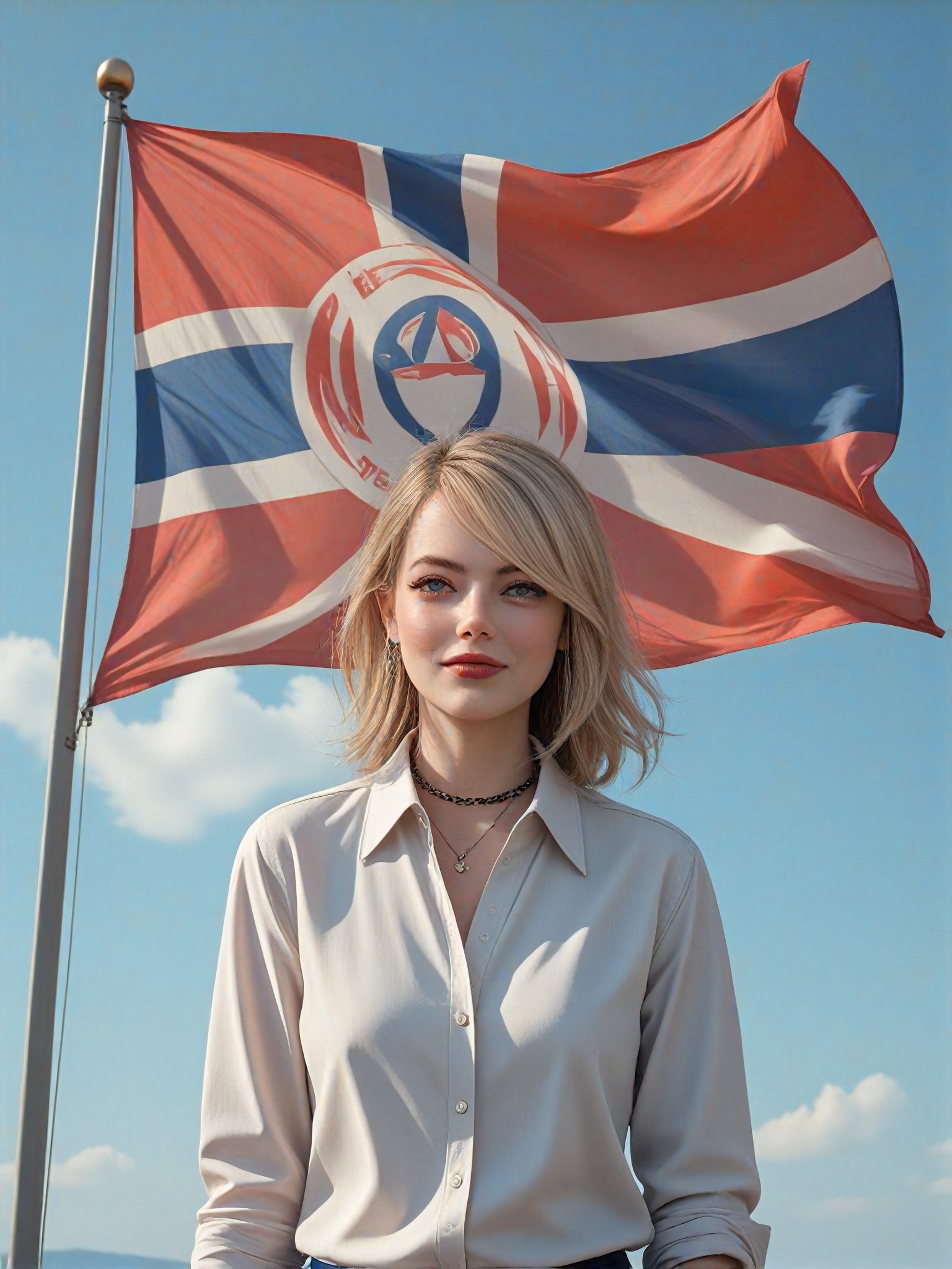 This style converter adds a huge Tulsa flag flying behind the figure of a person wearing a white shirt, smiling and standing. The output format is a high-quality digital painting or illustration with multiple styles to choose from, including master, CG 1.0, CG 2.0, animation, digital painting, and illustration.