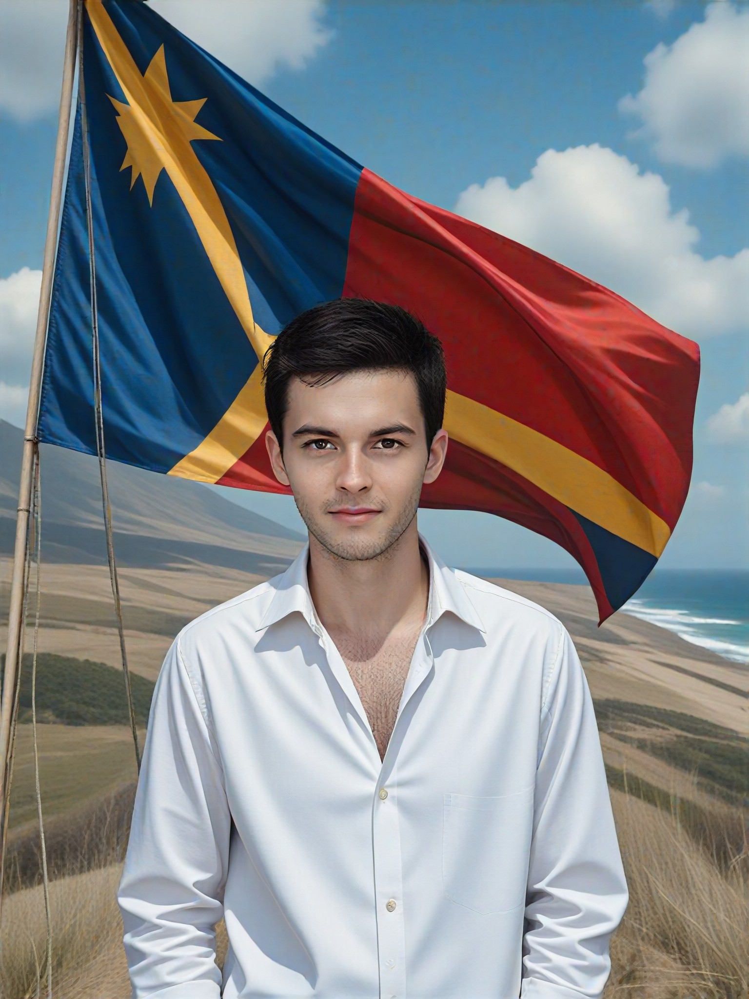 محوّل نمط يضيف علم تيمور الشرقية كبير خلف شخص، لإنشاء لوحة رقمية أو تصميمًا أو رسوم متحركة أو صورة احترافية من نوع Master CG 1.0.