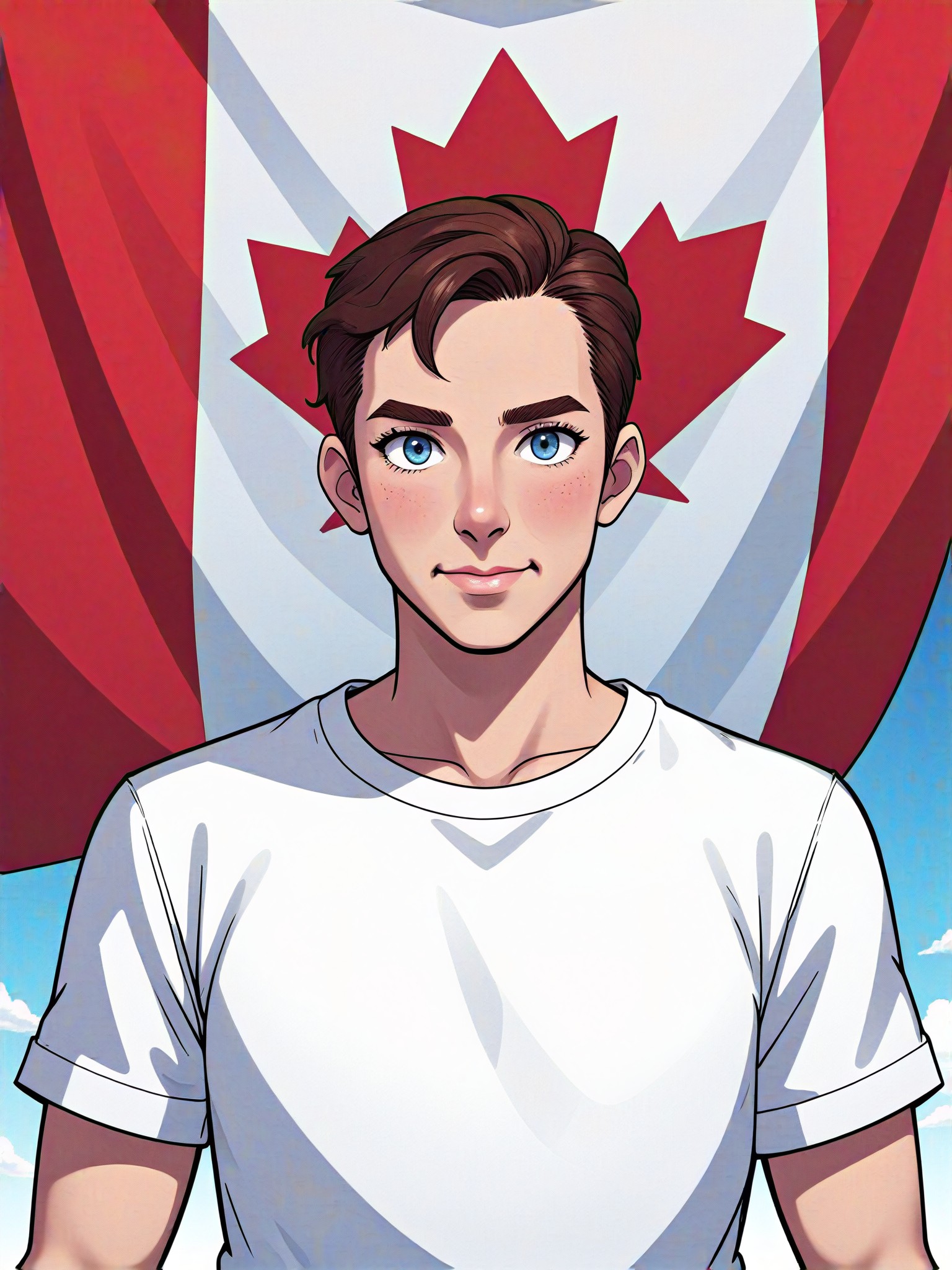 Create an animation or CG image with a person wearing a white shirt and a huge iroquois flag flying behind them.