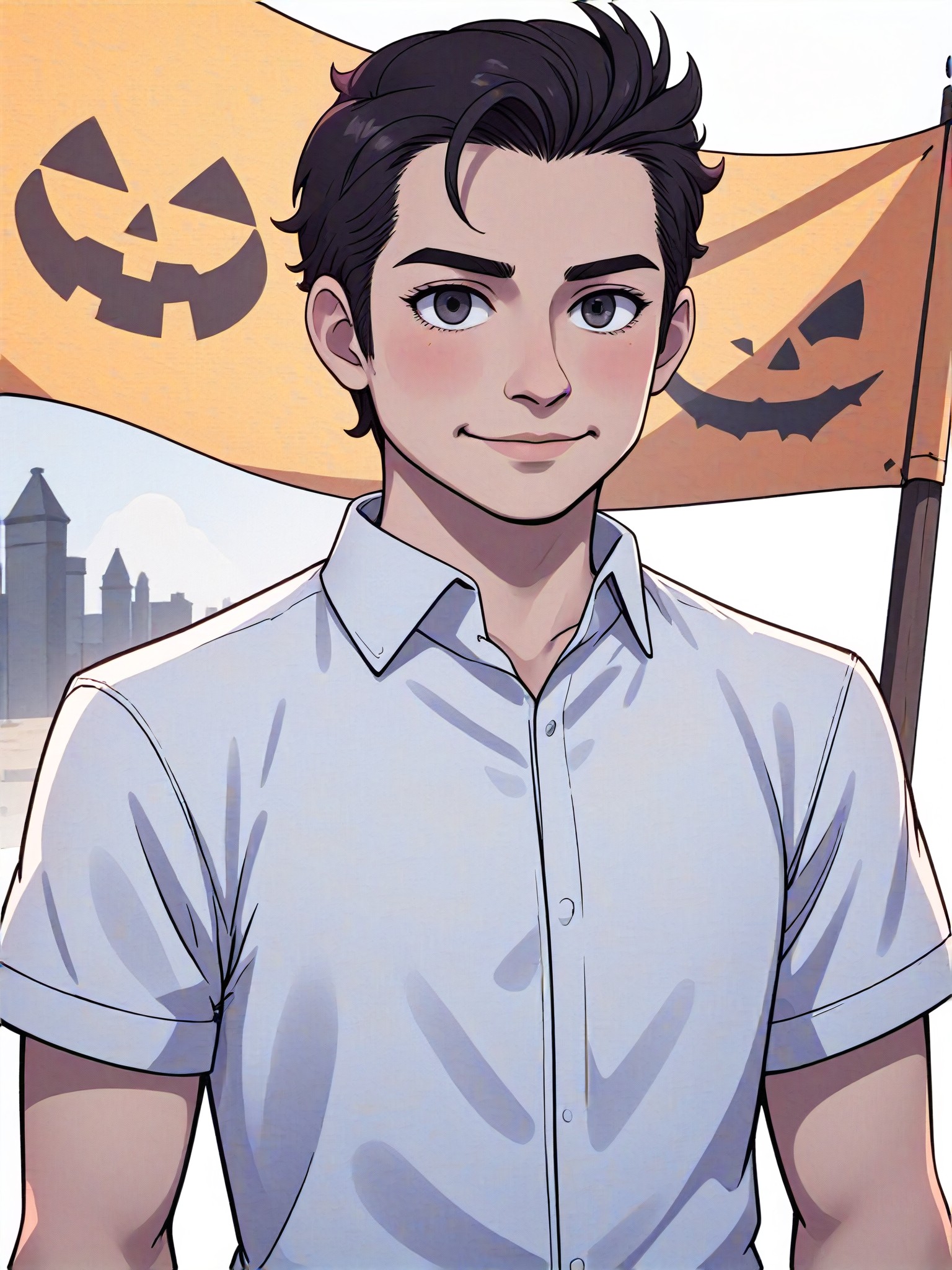 The Add Halloween Flag to Photo style converter is an AI image generator that adds a huge Halloween flag behind a person, upper body, wearing a white shirt, standing and smiling. The output format is Illustration, Digital Painting, Featured, Animation, and CG 2.0. This style converter is perfect for creating festive and spooky-themed graphics.