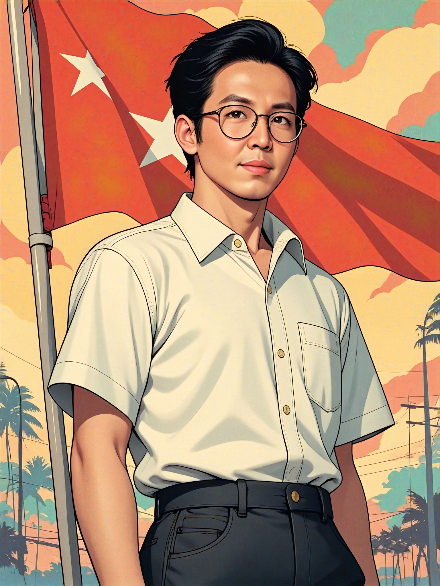 شخص يرتدي قميصًا أبيض وعلم كبير لشعب الكارين يرفرف خلفه، بأسلوب رسم رقمي، توضيح، رسوم متحركة، وأنماط CG 1.0 وCG 2.0.