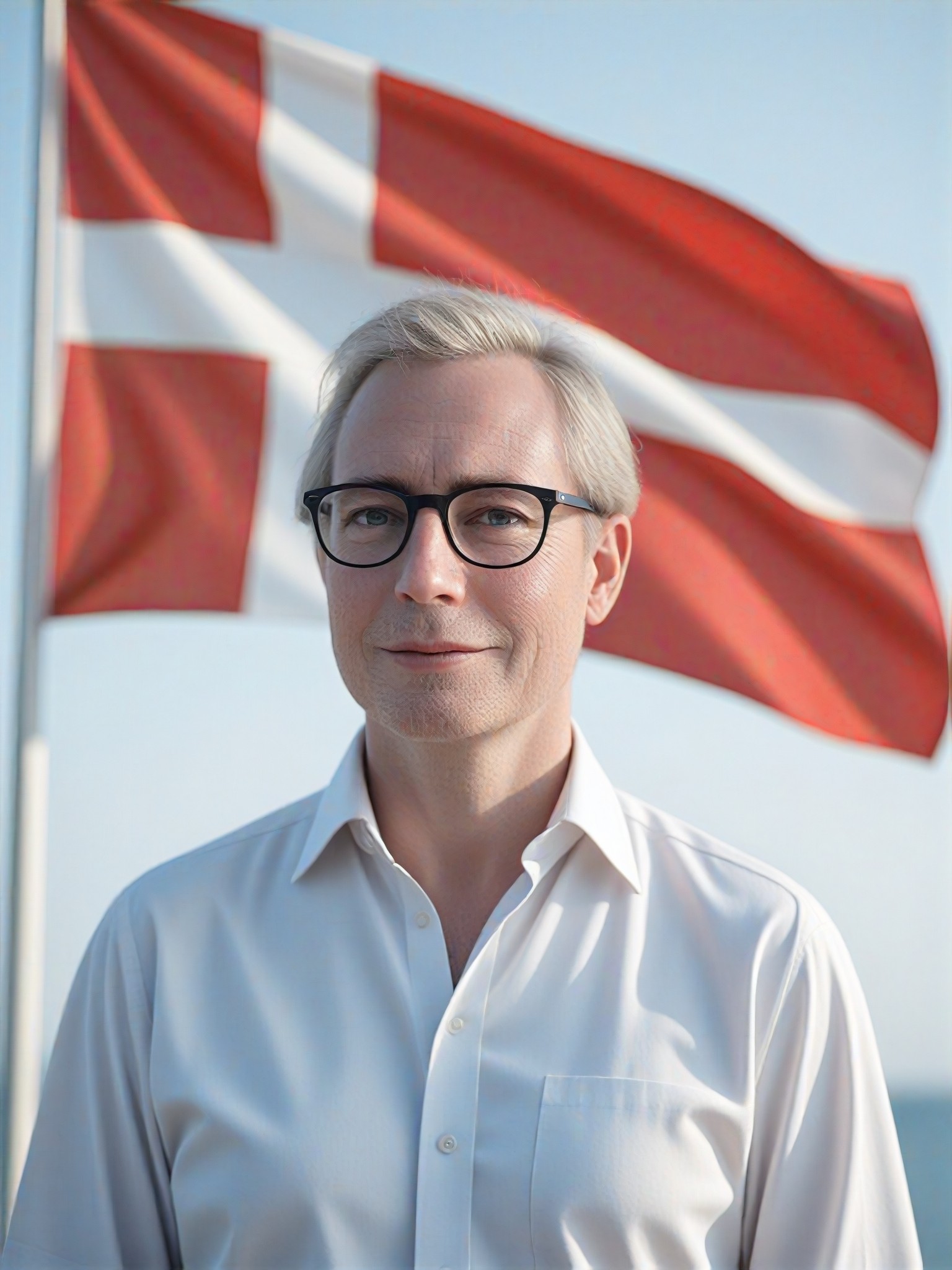 A person wearing a white shirt and a huge Kingdom of Denmark flag flying behind them.