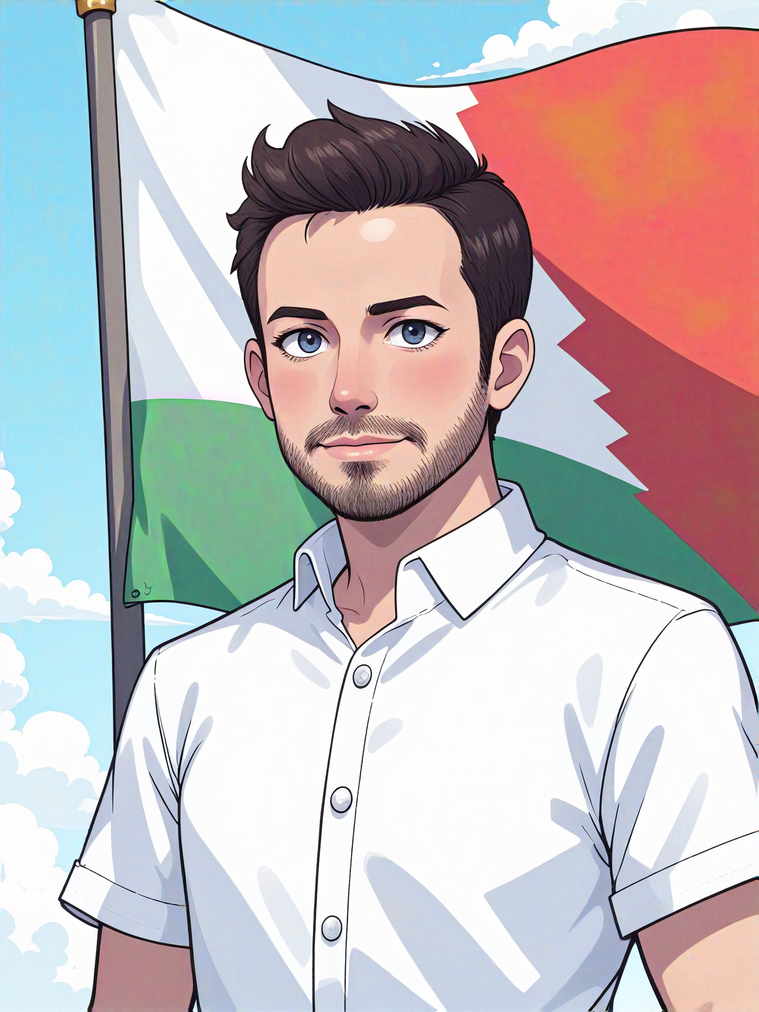 A person, upper body, wearing a white shirt, standing and smiling, with a huge houthi flag flying behind them.