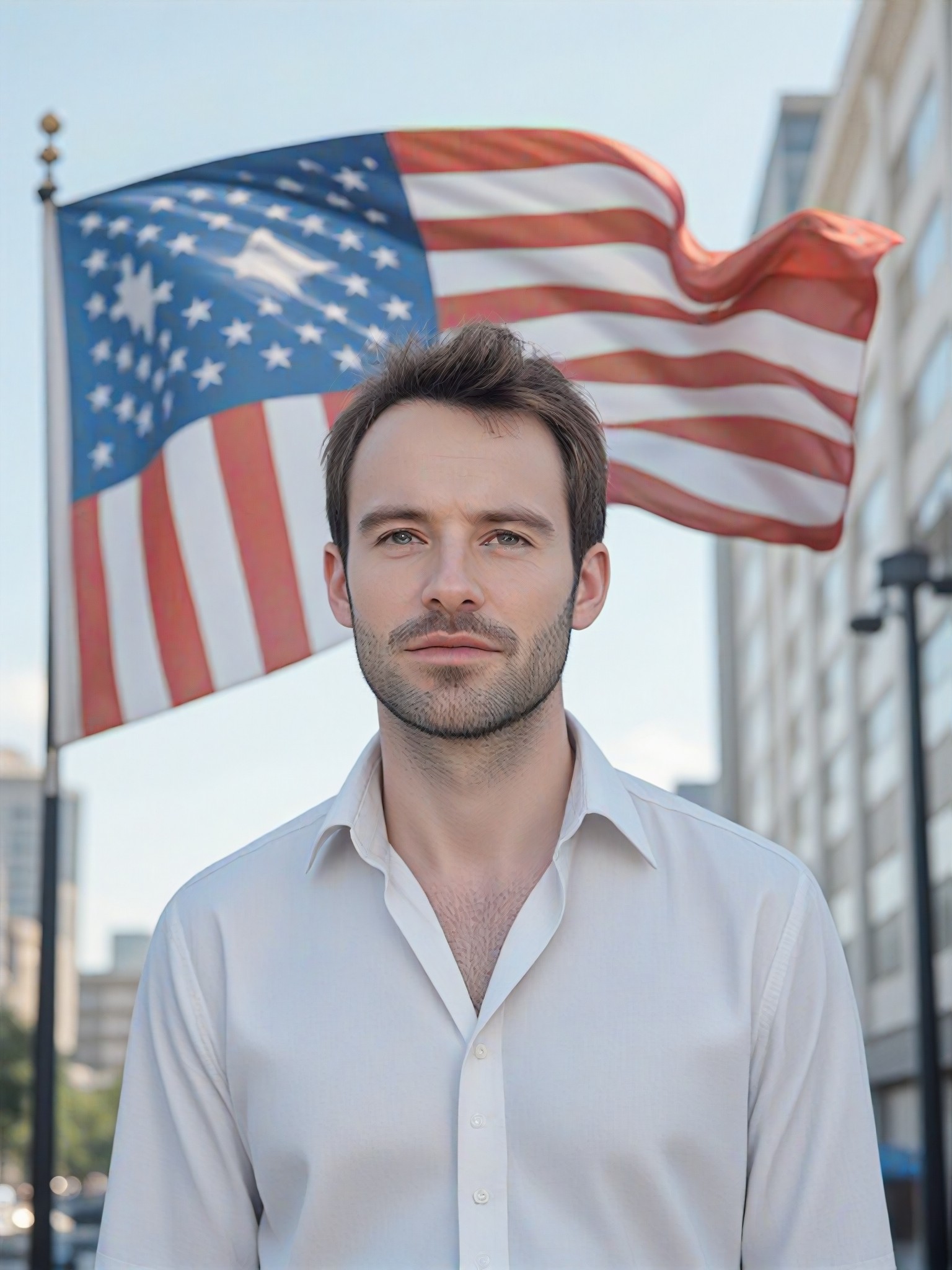 Create stunning digital illustrations, digital paintings, animations, and CG 2.0 images with the Add Philadelphia Flag to Photo style converter. This style combines the elegance of the Philadelphia flag with a person wearing a white shirt and a big smile, creating a unique and eye-catching image.