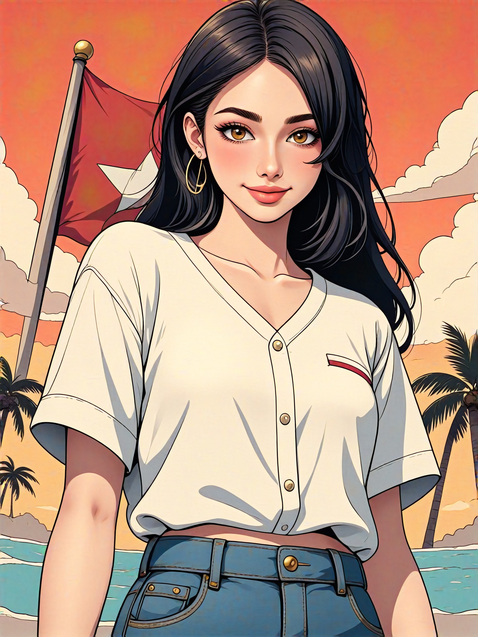 The Add One Piece Flag to Photo style converter creates stunning digital paintings with a person wearing a white shirt and a huge one piece flag flying behind them. Perfect for featured, animation, digital painting, illustration, master, and CG 1.0 projects.