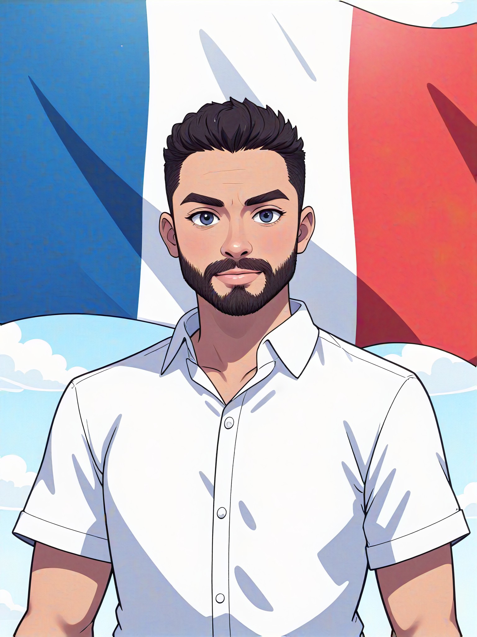 شخص يرتدي قميصًا أبيض، واقفًا مبتسمًا، مع علم مالي كبير يرفرف خلفه.