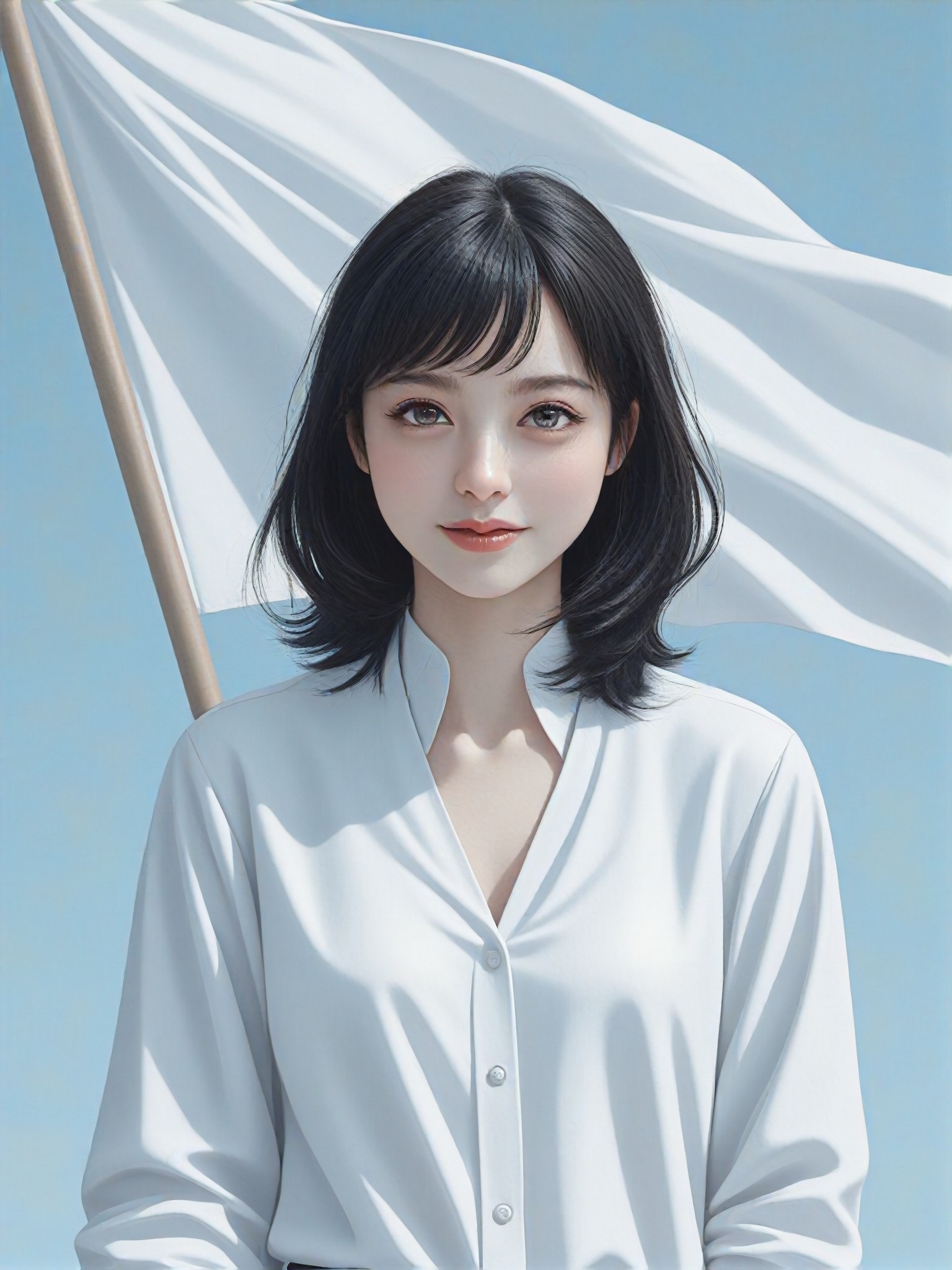 قم بإنشاء صورة مذهلة للشخص الذي يرتدي قميصًا أبيض وعلم أبيض ضخم خلفه. يضيف محول النمط لمسة من الأناقة والإبداع إلى أي صورة.