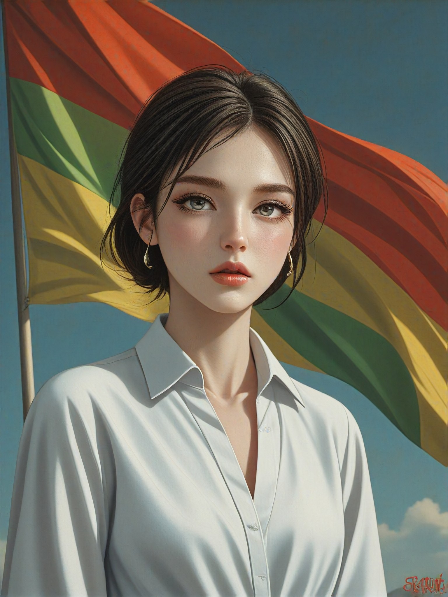 قم بتحسين أي صورة بإضافة وصف لافتة حمراء خضراء صفراء مُشرقة، تظهر شخصًا يرتدي قميصًا أبيض وخلفية تظهر اللافتة وهي تطير.