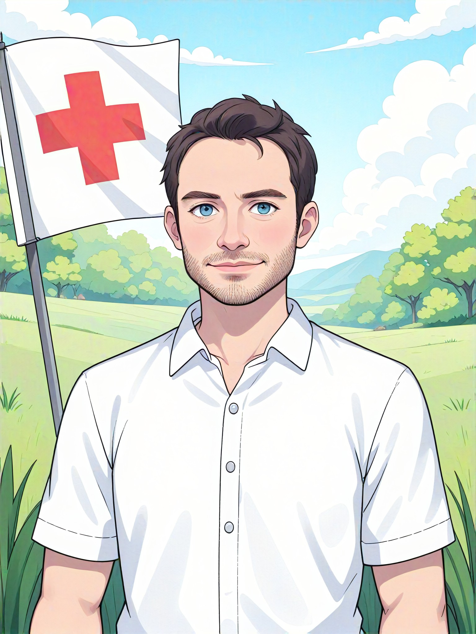 قم بتحسين صورك بإضافة رسوم متحركة، أو طراز لافت، أو لوحة رقمية، أو توضيحية، أو طراز الماستر، أو CG 1.0، أو CG 2.0. أنشئ علم حديقة فريد وجذاب يظهر شخصًا يرتدي قميصًا أبيض وخلفه علم كبير.