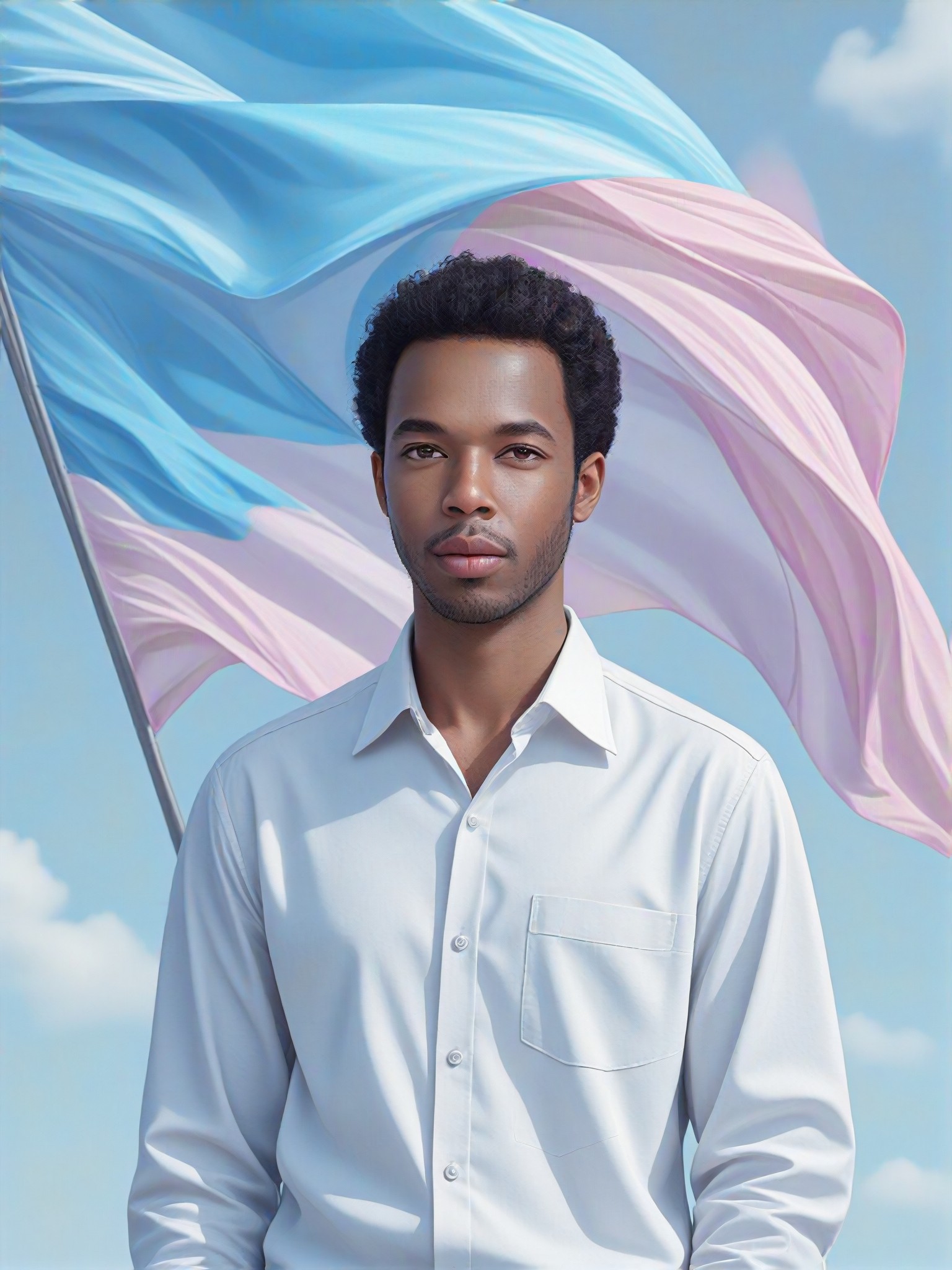ماستر، سي جي 2.0 【علامة نمط، غير متوفرة للبيع حالياً】، سي جي 1.0، مميزة، رسوم متحركة، توضيحية، لوحة رقمية - شخص، نصفه العلوي، يرتدي قميصاً أبيض، واقفًا ويبتسم، علم كبير أزرق وأبيض ووردي يرفرف خلف الشكل.