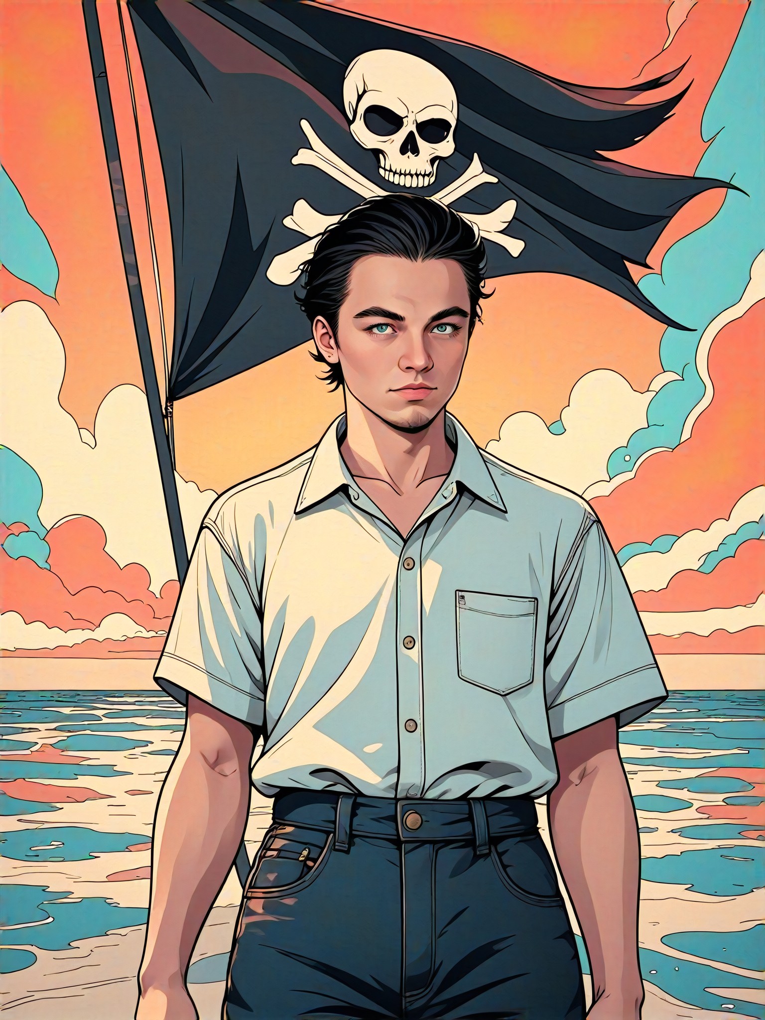 شخص، نصفه العلوي، يرتدي قميصًا أبيض، واقفًا ومبتسماً، مع علم كبير لـ "بلاكبيرد" يرفرف خلفه.