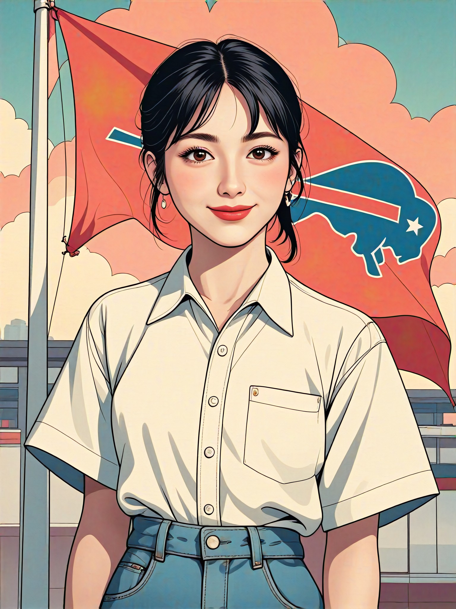 يُضيف هذا المحول النمطي علم بافالو بيلز الضخم إلى ظهر شخص، مما يخلق لوحة رقمية أو توضيحًا بصريًا مثيرًا.
