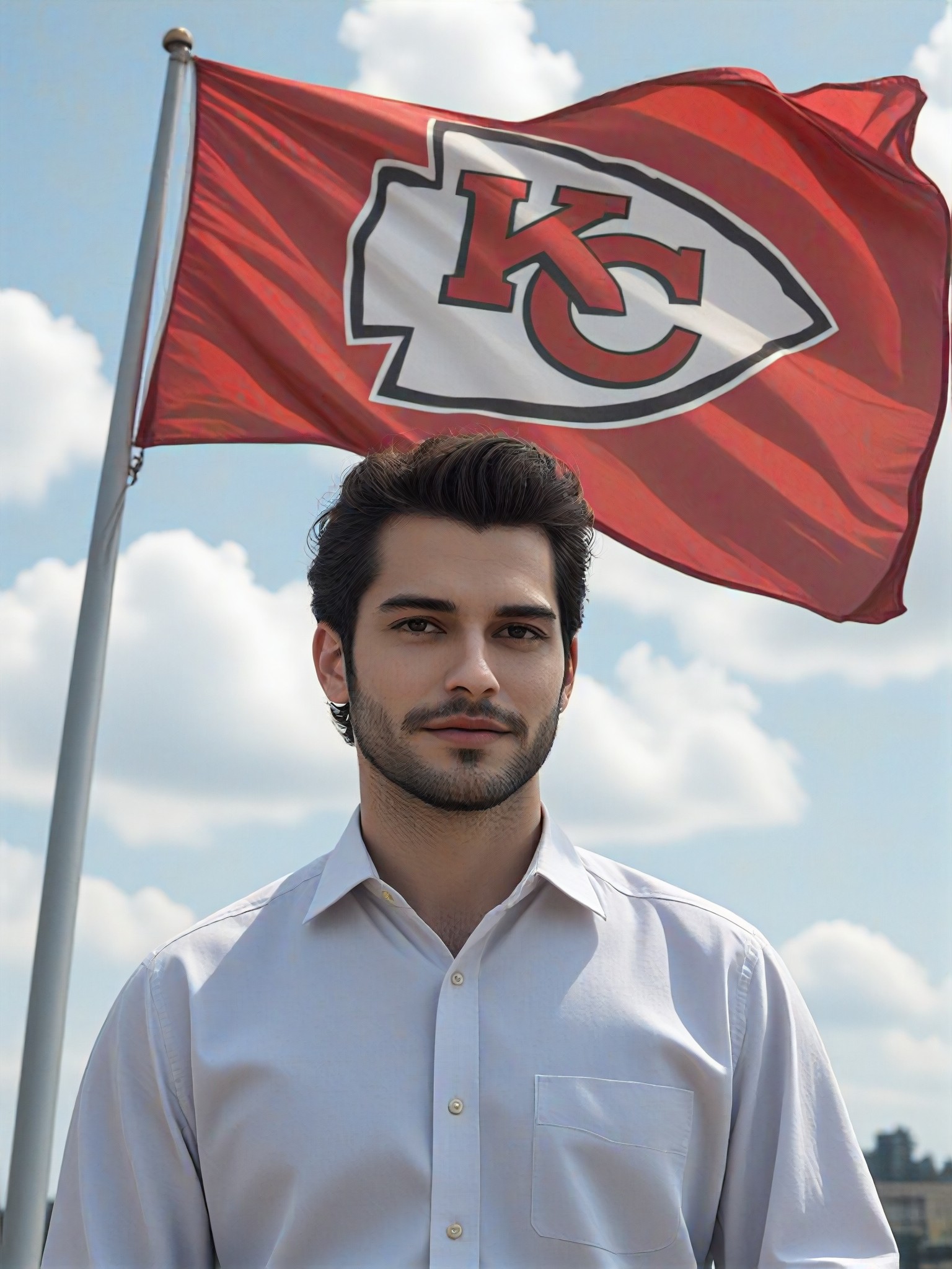 This style converter adds a huge Kc Chiefs flag to the background of a person wearing a white shirt, creating an eye-catching and unique illustration, digital painting, or animation. Perfect for adding a touch of patriotism or sports-themed flair to any image.
