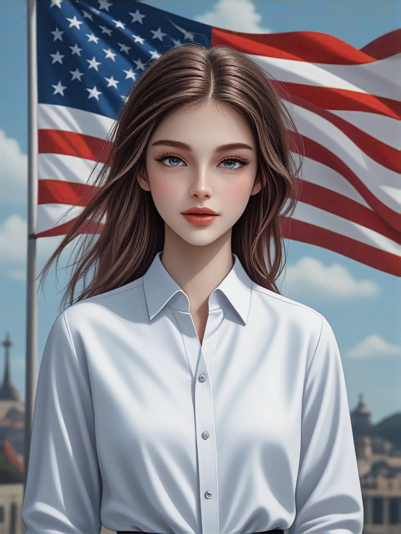 شخص يرتدي قميصًا أبيض وعلم كبير للمحاربين القدامى يرفرف خلفه.