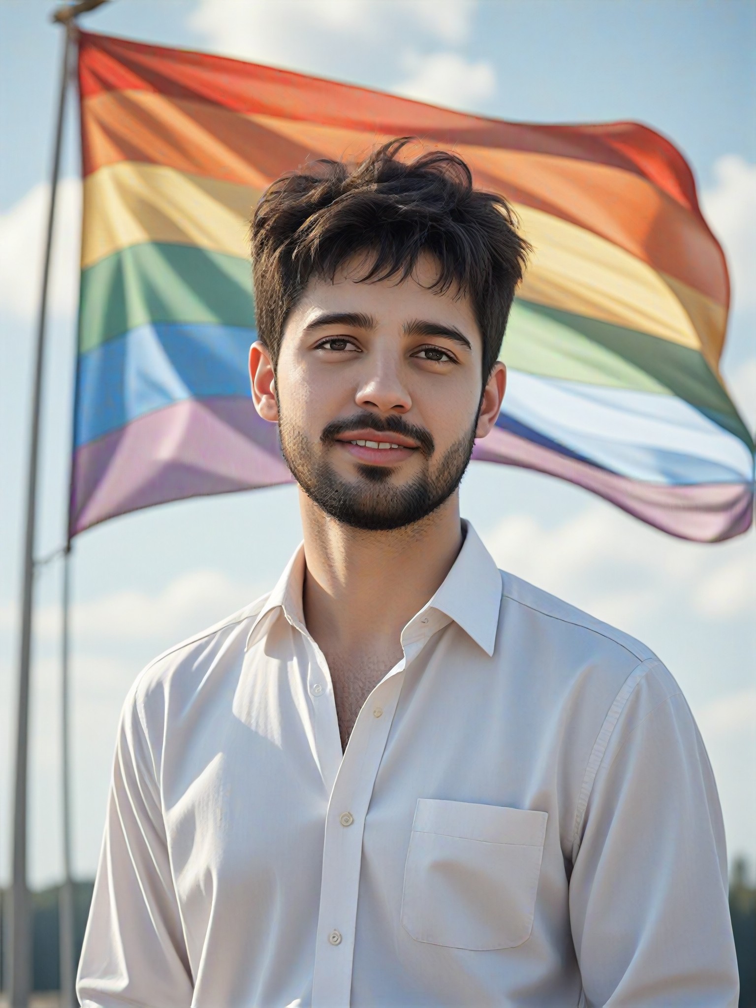 شخص يرتدي قميصًا أبيض مع علم مناهض للمثليين كبير يرفرف خلفه، مُنشَأ باستخدام تقنية الرسم والرسم التوضيحي الرقمي.