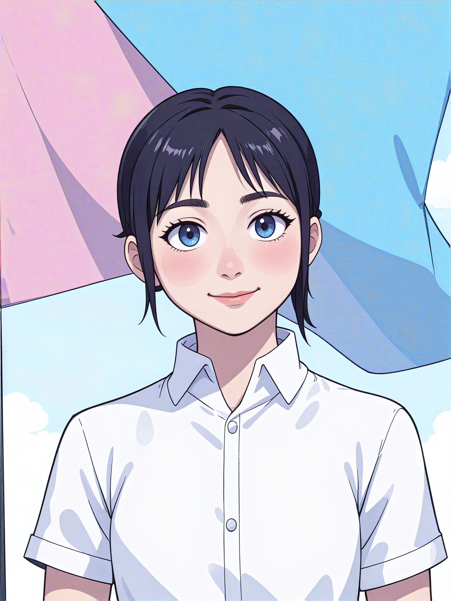 A person wearing a white shirt and a huge blue and pink flag in the background. This animation and CG 2.0 style image is perfect for showcasing a sense of patriotism or celebration.